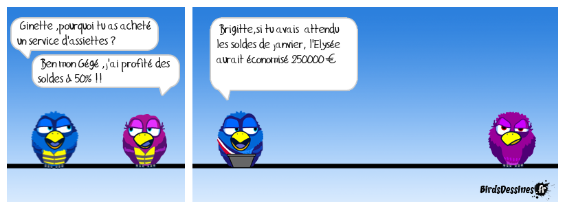 Case 1:Bird 1: Ginette ,pourquoi tu as acheté un service d'assiettes ?Bird 2: Ben mon Gégé ,j'ai profité des soldes à 50% !! | Case 2: Bird 1: Brigitte,si tu avais attendu les soldes de janvier, l'Elysée aurait économisé 250000 € | Case 3: