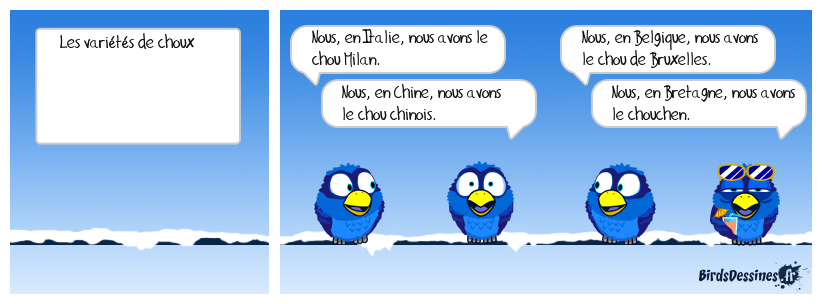 Case 1:Bird 1: Les variétés de choux | Case 2: Bird 1: Nous, en Italie, nous avons le chou Milan. Bird 2: Nous, en Chine, nous avons le chou chinois. | Case 3: Bird 1: Nous, en Belgique, nous avons le chou de Bruxelles. Bird 2: Nous, en Bretagne, nous avons le chouchen.