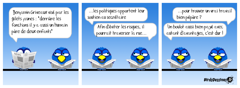 Case 1:Bird 1: Benjamin Griveaux visé par les gilets jaunes : "derrière les fonctions il y a aussi un humain père de deux enfants" | Case 2: Bird 1: ...les politiques apportent leur soutien au secrétaire d'état..... Bird 2: Afin d'éviter les risques, il pourrait traverser la rue... | Case 3: Bird 1: ...pour trouver un vrai travail bien pépère ? Bird 2: Un boulot aussi bien payé avec autant d'avantages, c'est dur !