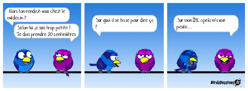 Case 1:Bird 1: Alors ton rendez-vous chez le médecin ?Bird 2: Selon lui je suis trop petite ! Je dois prendre 20 centimètres | Case 2: Bird 1: Sur quoi il se base pour dire ça ? | Case 3: Bird 1: Sur mon IMC après m'avoir pesée...