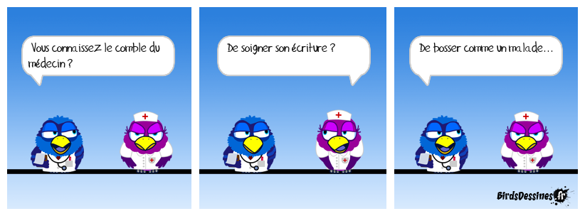 Case 1:Bird 1: Vous connaissez le comble du médecin ? | Case 2: Bird 1: De soigner son écriture ? | Case 3: Bird 1: De bosser comme un malade...