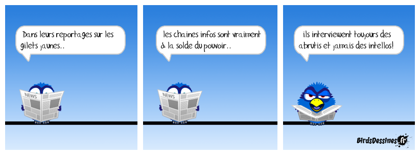 Case 1:Bird 1: Dans leurs reportages sur les gilets jaunes.. | Case 2: Bird 1: les chaines infos sont vraiment à la solde du pouvoir.. | Case 3: Bird 1: ils interviewent toujours des abrutis et jamais des intellos!