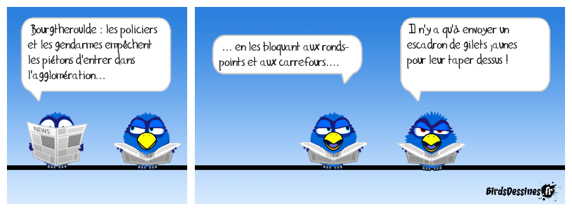 Case 1:Bird 1: Bourgtheroulde : les policiers et les gendarmes empêchent les piétons d'entrer dans l'agglomération... | Case 2: Bird 1: ... en les bloquant aux ronds- points et aux carrefours.... | Case 3: Bird 1: Il n'y a qu'à envoyer un escadron de gilets jaunes pour leur taper dessus !