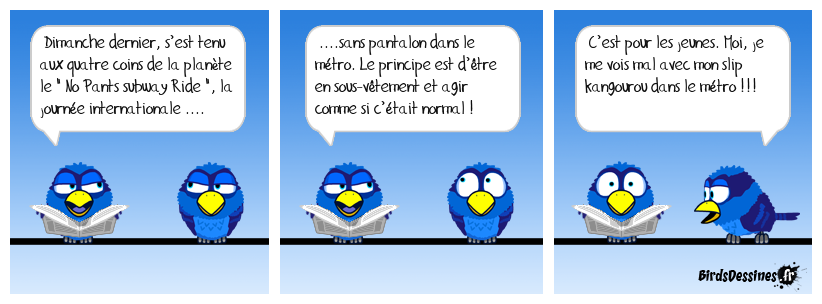 Case 1:Bird 1: Dimanche dernier, s’est tenu aux quatre coins de la planète le " No Pants subway Ride ", la journée internationale .... | Case 2: Bird 1: ....sans pantalon dans le métro. Le principe est d’être en sous-vêtement et agir comme si c’était normal ! | Case 3: Bird 1: C’est pour les jeunes. Moi, je me vois mal avec mon slip kangourou dans le métro !!!