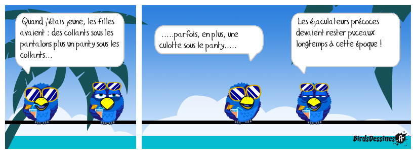 Case 1:Bird 1: Quand j'étais jeune, les filles avaient : des collants sous les pantalons plus un panty sous les collants... | Case 2: Bird 1: .....parfois, en plus, une culotte sous le panty..... | Case 3: Bird 1: Les éjaculateurs précoces devaient rester puceaux longtemps à cette époque !