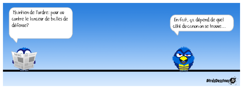 Case 1:Bird 1: Maintien de l'ordre: pour ou contre le lanceur de balles de défense? | Case 2: | Case 3: Bird 1: En fait, ça dépend de quel côté du canon on se trouve...