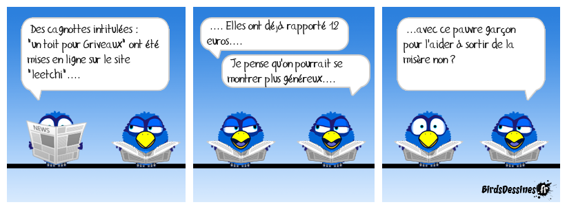 Case 1:Bird 1: Des cagnottes intitulées : "un toit pour Griveaux" ont été mises en ligne sur le site "leetchi".... | Case 2: Bird 1: .... Elles ont déjà rapporté 12 euros.... Bird 2: Je pense qu'on pourrait se montrer plus généreux.... | Case 3: Bird 1: ...avec ce pauvre garçon pour l'aider à sortir de la misère non ?