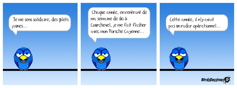 Case 1:Bird 1: Je me sens solidaire, des gilets jaunes... | Case 2: Bird 1: Chaque année, en rentrant de ma semaine de ski à Courchevel, je me fait flasher avec mon Porsche Cayenne... | Case 3: Bird 1: Cette année, il n'y avait pas un radar opérationnel...