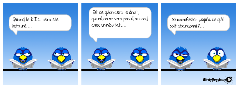Case 1:Bird 1: Quand le R.I.C. aura été instauré,... | Case 2: Bird 1: Est ce qu'on aura le droit, quand on ne sera pas d’accord avec un résultat,... | Case 3: Bird 1: De manifester jusqu’à ce qu'il soit abandonné?...