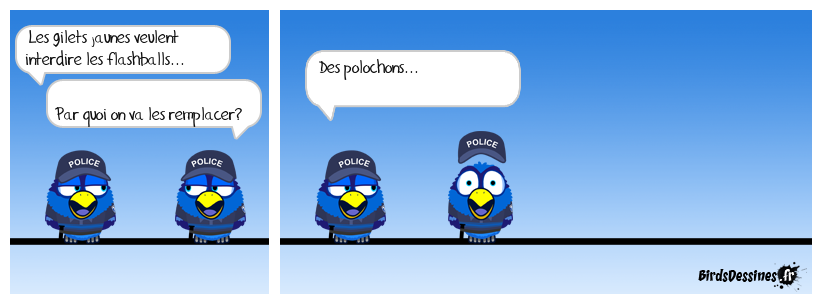 Case 1:Bird 1: Les gilets jaunes veulent interdire les flashballs...Bird 2: Par quoi on va les remplacer? | Case 2: Bird 1: Des polochons... | Case 3: Bird 1: ...en plumes d'oies...