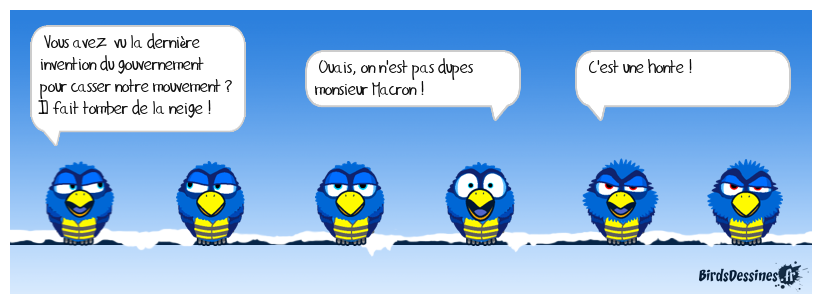 Case 1:Bird 1: Vous avez vu la dernière invention du gouvernement pour casser notre mouvement ? Il fait tomber de la neige ! | Case 2: Bird 1: Ouais, on n'est pas dupes monsieur Macron ! | Case 3: Bird 1: C'est une honte !