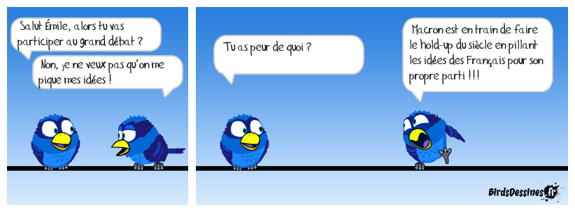 Case 1:Bird 1: Salut Èmile, alors tu vas participer au grand débat ?Bird 2: Non, je ne veux pas qu’on me pique mes idées ! | Case 2: Bird 1: Tu as peur de quoi ? | Case 3: Bird 1: Macron est en train de faire le hold-up du siècle en pillant les idées des Français pour son propre parti !!!