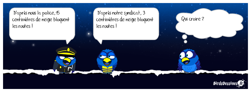 Case 1:Bird 1: D'après nous la police,15 centimètres de neige bloquent les routes ! | Case 2: Bird 1: D'après notre syndicat, 3 centimètres de neige bloquent les routes ! | Case 3: Bird 1: Qui croire ?
