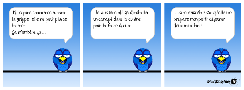 Case 1:Bird 1: Ma copine commence à avoir la grippe, elle ne peut plus se traîner... Ça m'embête ça... | Case 2: Bird 1: Je vais être obligé d'installer un canapé dans la cuisine pour la faire dormir.... | Case 3: Bird 1: ...si je veux être sûr qu'elle me prépare mon petit déjeuner demain matin !