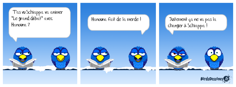 Case 1:Bird 1: T'as vu Schiappa va animer "Le grand débat" avec Hanouna ? | Case 2: Bird 1: Hanouna fait de la merde ! | Case 3: Bird 1: Justement ça ne va pas la changer à Schiappa !