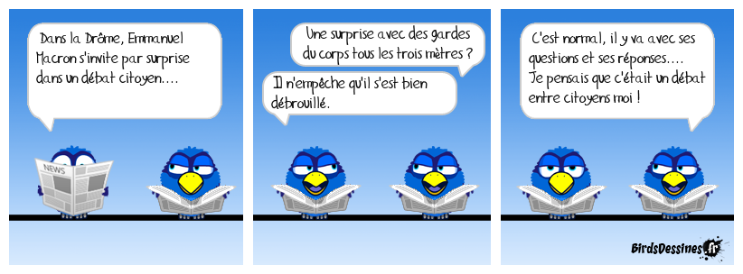Case 1:Bird 1: Dans la Drôme, Emmanuel Macron s'invite par surprise dans un débat citoyen.... | Case 2: Bird 1: Une surprise avec des gardes du corps tous les trois mètres ? Bird 2: Il n'empêche qu'il s'est bien débrouillé. | Case 3: Bird 1: C'est normal, il y va avec ses questions et ses réponses.... Je pensais que c'était un débat entre citoyens moi !