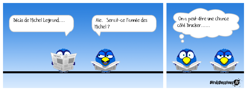Case 1:Bird 1: Décès de Michel Legrand.... | Case 2: Bird 1: Aîe. Serait-ce l'année des Michel ? | Case 3: Bird 1: On a peut-être une chance côté Drucker......