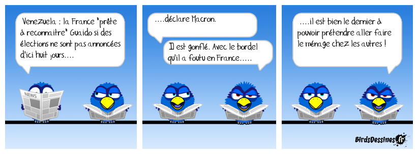 Case 1:Bird 1: Venezuela : la France "prête à reconnaitre" Guaido si des élections ne sont pas annoncées d'ici huit jours.... | Case 2: Bird 1: ....déclare Macron. Bird 2: Il est gonflé. Avec le bordel qu'il a foutu en France..... | Case 3: Bird 1: ....il est bien le dernier à pouvoir prétendre aller faire le ménage chez les autres !