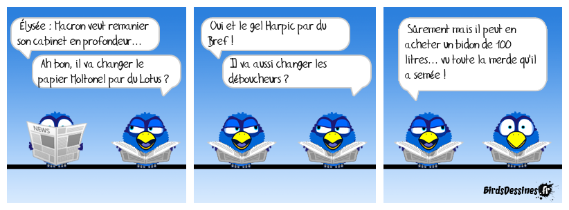 Case 1:Bird 1: Èlysée : Macron veut remanier son cabinet en profondeur...Bird 2: Ah bon, il va changer le papier Moltonel par du Lotus ? | Case 2: Bird 1: Oui et le gel Harpic par du Bref ! Bird 2: Il va aussi changer les déboucheurs ? | Case 3: Bird 1: Sûrement mais il peut en acheter un bidon de 100 litres... vu toute la merde qu'il a semée !