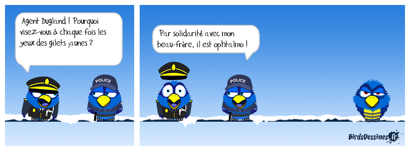 Case 1:Bird 1: Agent Dugland ! Pourquoi visez-vous à chaque fois les yeux des gilets jaunes ? | Case 2: Bird 1: Par solidarité avec mon beau-frère, il est ophtalmo ! | Case 3: