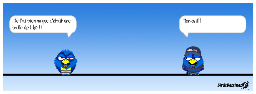 Case 1:Bird 1: Je l'ai bien vu que c'était une balle de LBD !! | Case 2: | Case 3: Bird 1: Mon œil!!