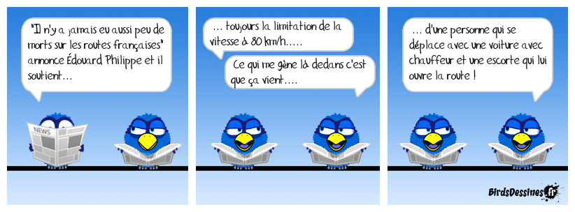 Case 1:Bird 1: "Il n'y a jamais eu aussi peu de morts sur les routes françaises" annonce Èdouard Philippe et il soutient... | Case 2: Bird 1: ... toujours la limitation de la vitesse à 80 km/h..... Bird 2: Ce qui me gène là dedans c'est que ça vient.... | Case 3: Bird 1: ... d'une personne qui se déplace avec une voiture avec chauffeur et une escorte qui lui ouvre la route !
