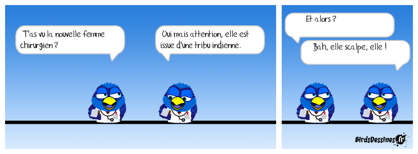 Case 1:Bird 1: T'as vu la nouvelle femme chirurgien ? | Case 2: Bird 1: Oui mais attention, elle est issue d'une tribu indienne. | Case 3: Bird 1: Et alors ? Bird 2: Bah, elle scalpe, elle !