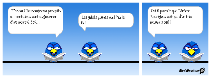 Case 1:Bird 1: T'as vu ? De nombreux produits alimentaires vont augmenter d'au moins 6,3 %... | Case 2: Bird 1: Les gilets jaunes vont hurler là ! | Case 3: Bird 1: Oui il paraît que Jérôme Rodrigues voit ça d'un très mauvais œil !