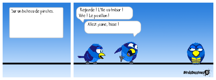 Case 1:Bird 1: Sur un bateau de pirates. | Case 2: Bird 1: Regarde ! L'ïle au trésor ! Vite ! Le pavillon ! Bird 2: Allez jaune, hisse ! | Case 3: