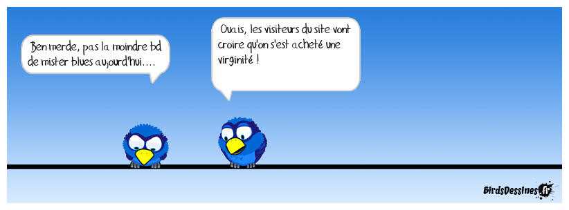 Case 1:Bird 1: Ben merde, pas la moindre bd de mister blues aujourd'hui.... | Case 2: Bird 1: Ouais, les visiteurs du site vont croire qu'on s'est acheté une virginité ! | Case 3: