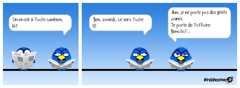 Case 1:Bird 1: On en est à l'acte combien, là? | Case 2: Bird 1: Ben, samedi, ce sera l'acte 12. | Case 3: Bird 1: Non, je ne parle pas des gilets jaunes. Je parle de l'affaire Benalla!...