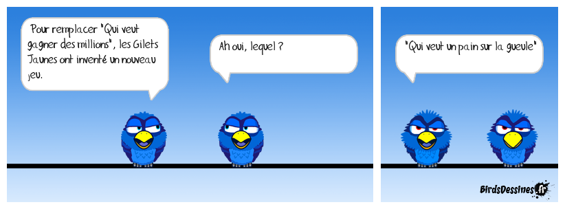 Case 1:Bird 1: Pour remplacer "Qui veut gagner des millions", les Gilets Jaunes ont inventé un nouveau jeu. | Case 2: Bird 1: Ah oui, lequel ? | Case 3: Bird 1: "Qui veut un pain sur la gueule"