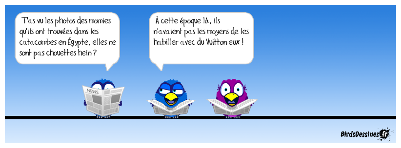 Case 1:Bird 1: T'as vu les photos des momies qu'ils ont trouvées dans les catacombes en Ègypte, elles ne sont pas chouettes hein ? | Case 2: Bird 1: À cette époque là, ils n'avaient pas les moyens de les habiller avec du Vuitton eux ! | Case 3:
