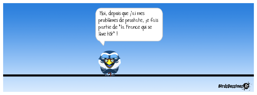 Case 1: | Case 2: Bird 1: Moi, depuis que j'ai mes problèmes de prostate, je fais partie de "la France qui se lève tôt" ! | Case 3: