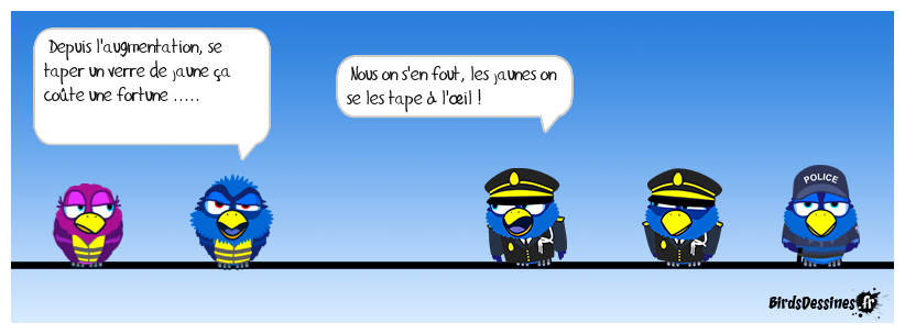 Case 1:Bird 1: Depuis l'augmentation, se taper un verre de jaune ça coûte une fortune ..... | Case 2: Bird 1: Nous on s'en fout, les jaunes on se les tape à l'œil ! | Case 3: