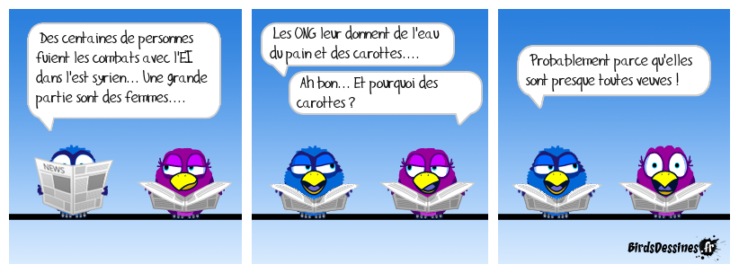 Case 1:Bird 1: Des centaines de personnes fuient les combats avec l'EI dans l'est syrien... Une grande partie sont des femmes.... | Case 2: Bird 1: Les ONG leur donnent de l'eau du pain et des carottes.... Bird 2: Ah bon... Et pourquoi des carottes ? | Case 3: Bird 1: Probablement parce qu'elles sont presque toutes veuves !