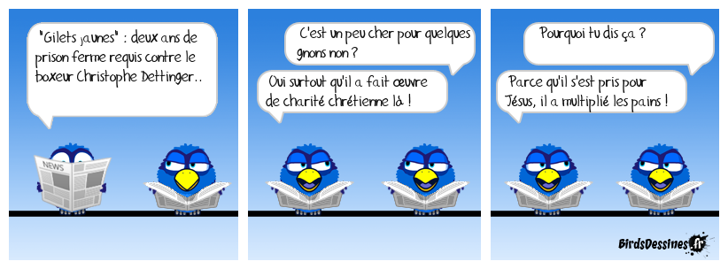 Case 1:Bird 1: "Gilets jaunes" : deux ans de prison ferme requis contre le boxeur Christophe Dettinger.. | Case 2: Bird 1: C'est un peu cher pour quelques gnons non ? Bird 2: Oui surtout qu'il a fait œuvre de charité chrétienne là ! | Case 3: Bird 1: Pourquoi tu dis ça ? Bird 2: Parce qu'il s'est pris pour Jésus, il a multiplié les pains !