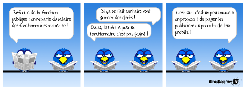 Case 1:Bird 1: Réforme de la fonction publique : on reparle du salaire des fonctionnaires au mérite ! | Case 2: Bird 1: Si ça se fait certains vont grincer des dents ! Bird 2: Ouais, le mérite pour un fonctionnaire c'est pas gagné ! | Case 3: Bird 1: C'est sûr, c'est un peu comme si on proposait de payer les politiciens au prorata de leur probité !