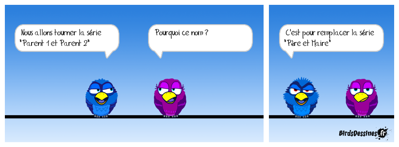 Case 1:Bird 1: Nous allons tourner la série "Parent 1 et Parent 2" | Case 2: Bird 1: Pourquoi ce nom ? | Case 3: Bird 1: C'est pour remplacer la série "Père et Maire"