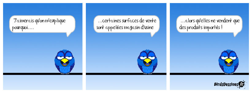 Case 1:Bird 1: J'aimerais qu'on m'explique pourquoi.... | Case 2: Bird 1: ...certaines surfaces de vente sont appelées magasin d'usine | Case 3: Bird 1: ...alors qu'elles ne vendent que des produits importés !