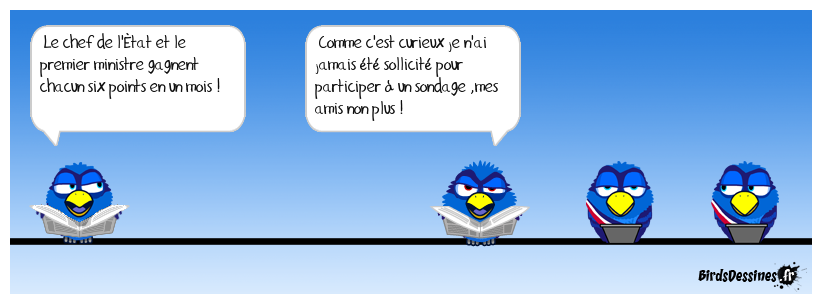 Case 1:Bird 1: Le chef de l'État et le premier ministre gagnent chacun six points en un mois ! | Case 2: Bird 1: Comme c'est curieux je n'ai jamais été sollicité pour participer à un sondage ,mes amis non plus ! | Case 3:
