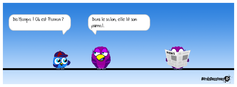 Case 1:Bird 1: Dis Mampa ! Où est Paman ? | Case 2: Bird 1: Dans le salon, elle lit son journal. | Case 3:
