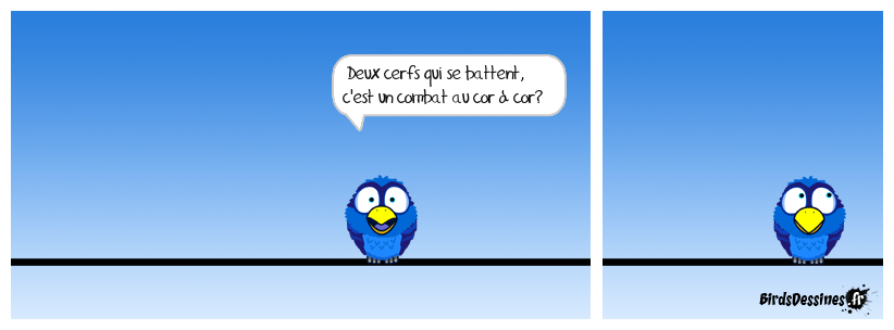 Case 1: | Case 2: Bird 1: Deux cerfs qui se battent, c'est un combat au cor à cor? | Case 3: