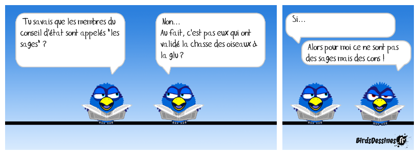 Case 1:Bird 1: Tu savais que les membres du conseil d'état sont appelés "les sages" ? | Case 2: Bird 1: Non... Au fait, c'est pas eux qui ont validé la chasse des oiseaux à la glu ? | Case 3: Bird 1: Si... Bird 2: Alors pour moi ce ne sont pas des sages mais des cons !