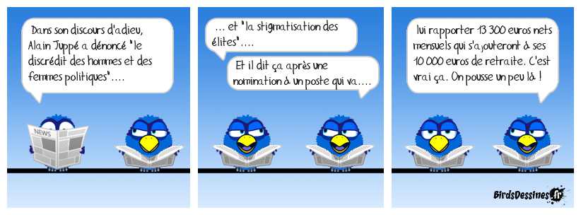 Case 1:Bird 1: Dans son discours d'adieu, Alain Juppé a dénoncé "le discrédit des hommes et des femmes politiques".... | Case 2: Bird 1: ... et "la stigmatisation des élites".... Bird 2: Et il dit ça après une nomination à un poste qui va.... | Case 3: Bird 1: lui rapporter 13 300 euros nets mensuels qui s'ajouteront à ses 10 000 euros de retraite. C'est vrai ça. On pousse un peu là !