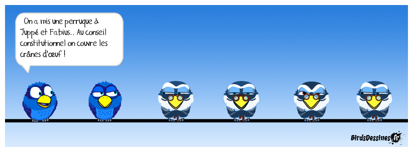 Case 1:Bird 1: On a mis une perruque à Juppé et Fabius.. Au conseil constitutionnel on couvre les crânes d'œuf ! | Case 2: | Case 3: