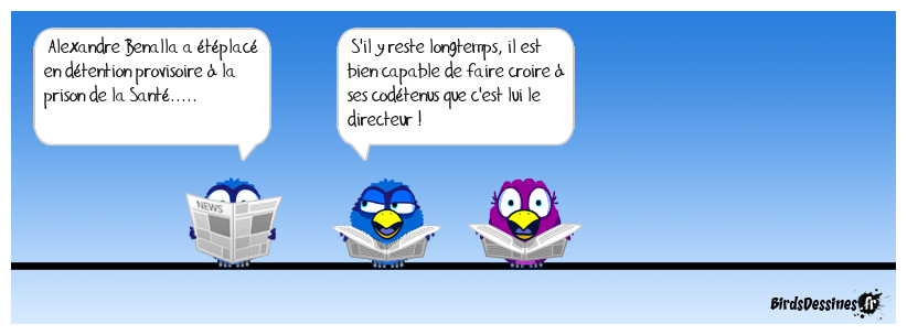 Case 1:Bird 1: Alexandre Benalla a étéplacé en détention provisoire à la prison de la Santé..... | Case 2: Bird 1: S'il y reste longtemps, il est bien capable de faire croire à ses codétenus que c'est lui le directeur ! | Case 3: