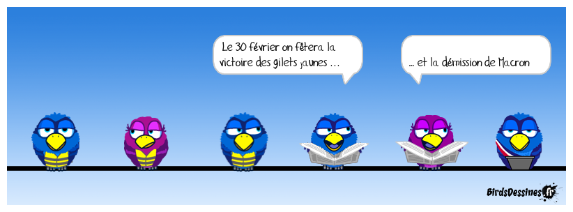Case 1: | Case 2: Bird 1: Le 30 février on fêtera la victoire des gilets jaunes ... | Case 3: Bird 1: … et la démission de Macron