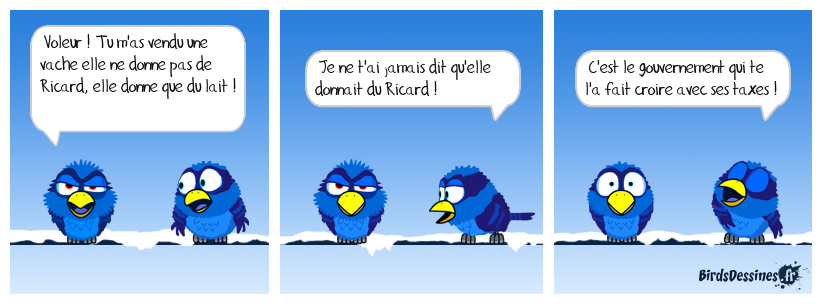 Case 1:Bird 1: Voleur ! Tu m'as vendu une vache elle ne donne pas de Ricard, elle donne que du lait ! | Case 2: Bird 1: Je ne t'ai jamais dit qu'elle donnait du Ricard ! | Case 3: Bird 1: C'est le gouvernement qui te l'a fait croire avec ses taxes !