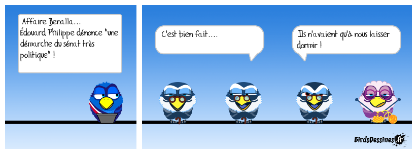 Case 1:Bird 1: Affaire Benalla... Èdouard Philippe dénonce "une démarche du sénat très politique" ! | Case 2: Bird 1: C'est bien fait.... | Case 3: Bird 1: Ils n'avaient qu'à nous laisser dormir !